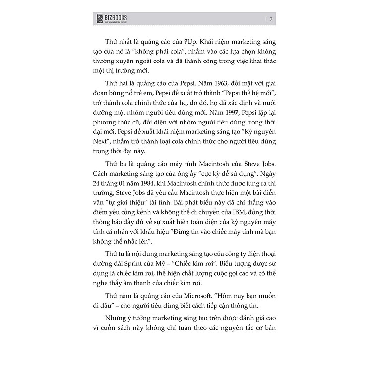 Nói nôm na là, cuốn sách này chỉ ra rằng sự sáng tạo không phải là một món quà trời ban, mà là một kỹ năng có thể học hỏi và phát triển. Với 168 phương pháp marketing sáng tạo được chia thành 11 chương, tác giả đã giúp bạn tiết kiệm thời gian và nắm bắt các kỹ thuật cần thiết một cách dễ dàng. Mỗi ngày, bạn có thể dành một chút thời gian để đọc và thực hành với những ví dụ và phân tích rất thực tế.