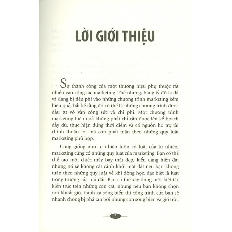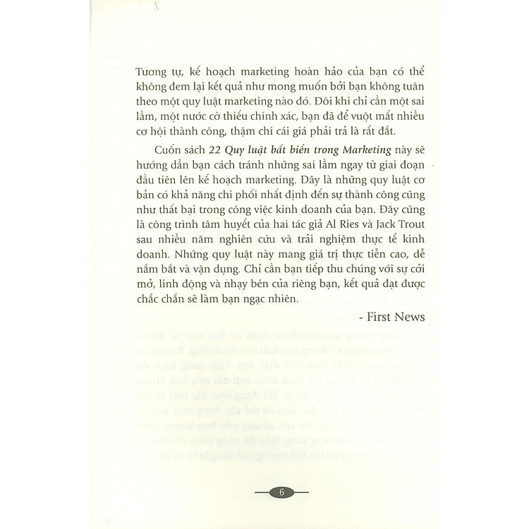 Nói nôm na là, cuốn sách này trình bày những quy luật bất biến trong marketing mà mọi doanh nhân, marketer đều nên nắm vững. Tác giả khẳng định rằng, một chương trình marketing hiệu quả không chỉ cần đầu tư tiền bạc và công sức, mà còn phải tuân theo những quy luật cơ bản. Nếu bạn không để ý đến điều này, bạn sẽ dễ dàng “đốt tiền” vào những chiến dịch kém hiệu quả.