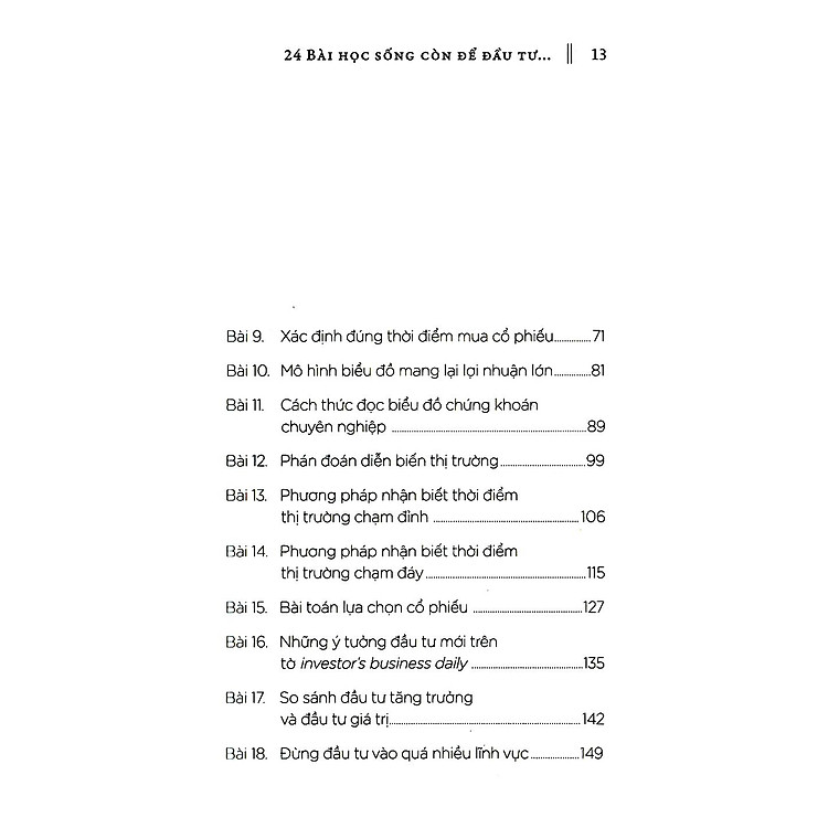 Cuốn sách được chia thành 24 bài học, mỗi bài học đều tập trung vào những khía cạnh quan trọng của thị trường chứng khoán. Từ cách phân tích thị trường, quản lý rủi ro cho đến việc xây dựng một danh mục đầu tư hiệu quả, bạn sẽ được trang bị đầy đủ kiến thức để tự tin tham gia vào sân chơi đầy cạnh tranh này. Hơn nữa, cuốn sách cũng đưa ra những sai lầm phổ biến mà nhiều nhà đầu tư mắc phải và cách để tránh chúng, giúp bạn có được những quyết định đầu tư khôn ngoan hơn.