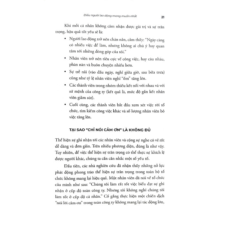 - Tăng cường sự gắn kết: Khi mọi người cảm thấy được trân trọng, họ sẽ hợp tác tốt hơn và cống hiến nhiều hơn cho công việc. Một ví dụ trong sách cho thấy việc ghi nhận nỗ lực của một nhân viên mới có thể làm tăng động lực làm việc không chỉ của họ mà còn của cả nhóm.