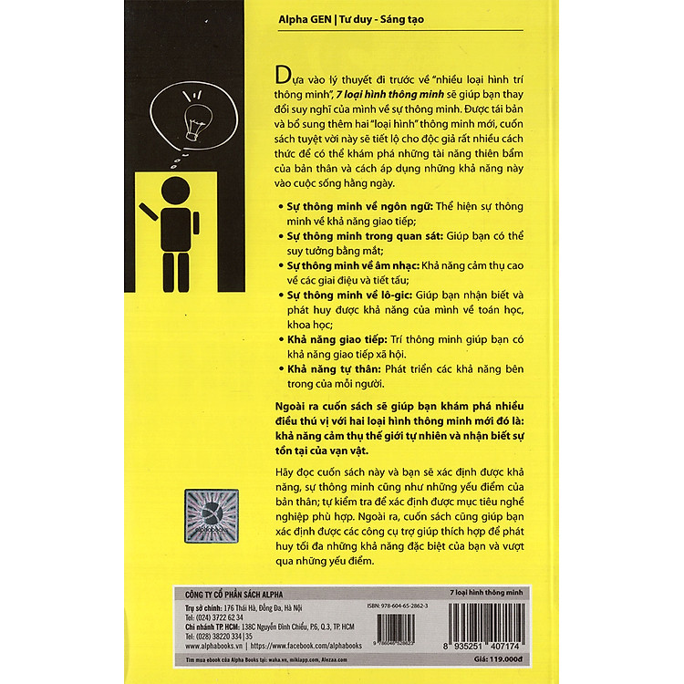 Trong cuộc sống hàng ngày, chúng ta thường nghe đến khái niệm “thông minh”. Nhưng thực sự, thông minh là gì và có bao nhiêu loại hình thông minh khác nhau? Bạn có bao giờ tự hỏi khả năng nhận thức của mình mạnh ở điểm nào và yếu ở đâu? Cuốn sách “7 Loại Hình Thông Minh” sẽ giúp bạn khám phá những khía cạnh đa dạng của trí thông minh, từ đó mở ra cánh cửa cho những tiềm năng chưa được khai thác. Cuốn sách này sẽ giúp bạn hiểu rõ hơn về bản thân và phát triển những năng lực tự nhiên của mình.
