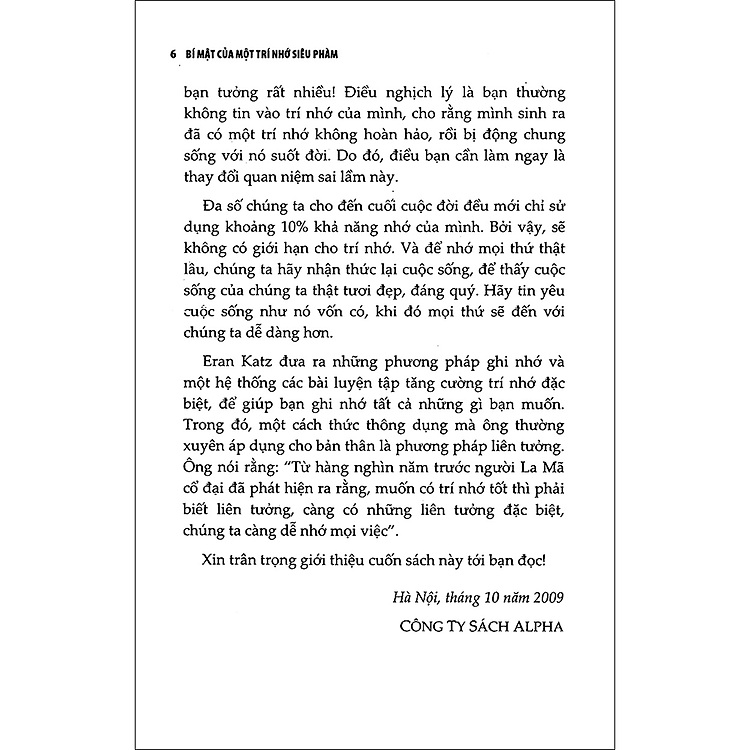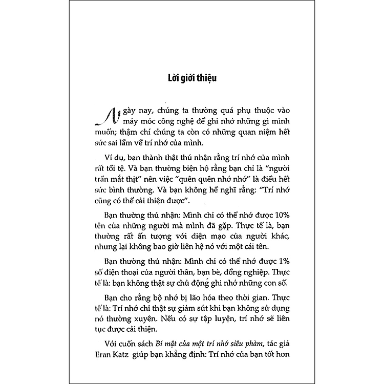 Mọi người thường nói đùa rằng trí nhớ của chúng ta chỉ như một cái rổ thủng. Thực ra, có phải vậy không? Cuốn sách “Bí Mật Của Trí Nhớ Siêu Phàm” của tác giả Eran Katz sẽ khiến bạn phải suy nghĩ lại về khả năng ghi nhớ của bản thân. Bỏ qua những lý do biện hộ, có khi bạn sẽ cảm thấy mình có nhiều hơn 10% khả năng ghi nhớ đấy!