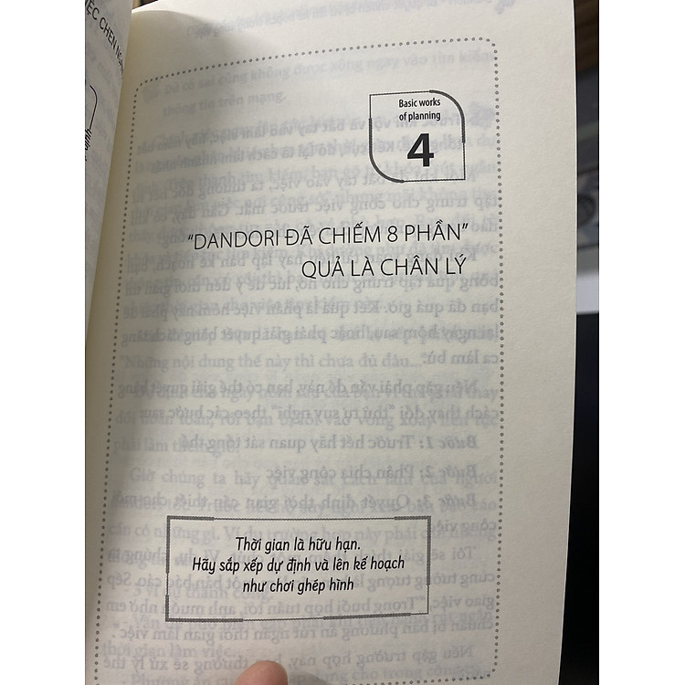 Cuốn sách “Bí Quyết Chuẩn Bị Và Lên Kế Hoạch Trong Công Việc – Những Điều Công Ty Không Dạy Bạn” của tác giả Iba Masayasu là một phần của bộ sách “Những Điều Công Ty Không Dạy Bạn”. Tác giả giới thiệu về khái niệm Dandori – một thuật ngữ phổ biến ở Nhật Bản, có nghĩa là năng lực chuẩn bị và sắp xếp công việc. Tác giả không chỉ đưa ra lý thuyết mà còn minh họa dễ hiểu qua hình ảnh, giúp người đọc dễ dàng nắm bắt và áp dụng vào thực tế.