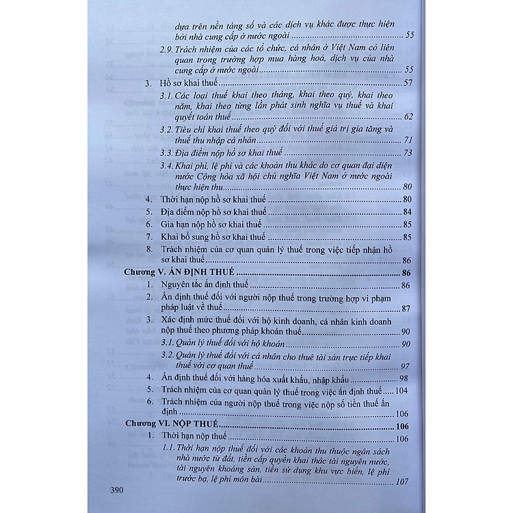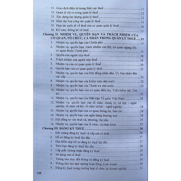 - Bao gồm các chương về quy định chung, nhiệm vụ, đăng ký thuế, khai thuế, nộp thuế và xử phạt vi phạm.
