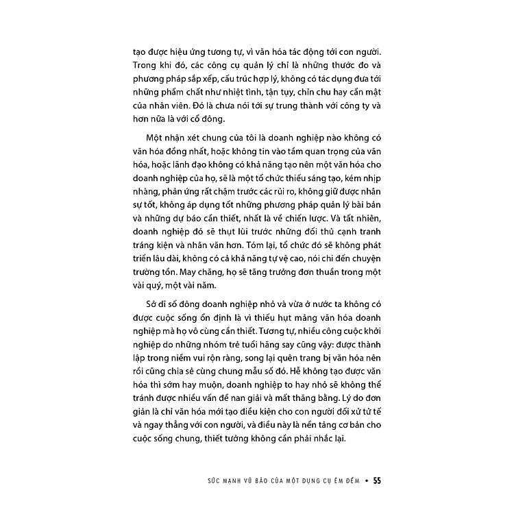 Nói một cách đơn giản, cuốn sách này tập trung vào việc giải quyết các vấn đề không thể xử lý chỉ bằng công cụ quản lý thông thường. Tác giả nhấn mạnh rằng văn hóa doanh nghiệp mới chính là chìa khóa để vượt qua những rào cản như thiếu động lực và mâu thuẫn nội bộ. Phan Văn Trường dẫn dắt người đọc tìm hiểu ba phong cách văn hóa mà ông đã áp dụng thành công trong những doanh nghiệp mà ông tham gia.