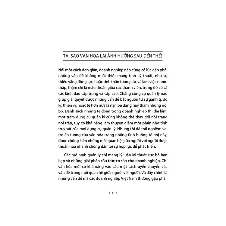 Nói nôm na là, tác phẩm này không chỉ dừng lại ở những công cụ quản lý khô khan, mà còn đi sâu vào tâm hồn của doanh nghiệp. Phan Văn Trường chỉ ra rằng, văn hóa mới chính là chìa khóa để giải quyết những vấn đề phức tạp trong quan hệ con người. Ông nhấn mạnh rằng, không có giải pháp nào có thể thay thế cho việc xây dựng một môi trường làm việc tích cực và đoàn kết.