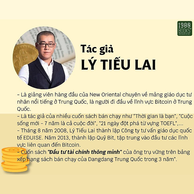 Lý Tiếu Lai, tác giả của cuốn sách, là giảng viên hàng đầu của New Oriental và là một trong những người đi đầu trong lĩnh vực Bitcoin tại Trung Quốc. Ông đã viết nhiều cuốn sách bán chạy và hiện tại có 170.000 lượt theo dõi trên chuyên trang cá nhân. “Đầu tư tài chính thông minh” đã trụ vững trên bảng xếp hạng sách bán chạy của Dangdang Trung Quốc trong suốt ba năm. Nếu bạn đang tìm kiếm một hướng đi mới cho tài chính cá nhân và ước mơ về tự do tài chính, đừng ngần ngại sở hữu cuốn sách này tại Nhà Sách Vĩnh Thụy ngay hôm nay!