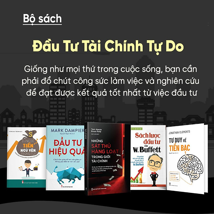 - Combo sách gồm 5 cuốn: “Tư Duy Về Tiền Bạc”, “Những Sát Thủ Hàng Loạt Trong Giới Tài Chính”, “Sách Lược Đầu Tư Của W.Buffett”, “Đừng Để Tiền Ngủ Yên Trong Túi”, và “Đầu Tư Hiệu Quả”.