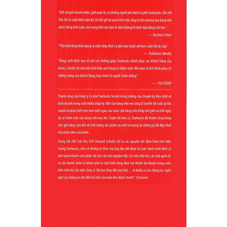 “Dốc Hết Trái Tim” là một cuốn sách không chỉ chứa đựng những câu chuyện kinh doanh mà còn là một hành trình tâm hồn đầy cảm hứng. Như lời của Howard Schultz, “Nếu bạn chinh phục trí tưởng tượng của khách hàng, bạn chính là người chiến thắng.” Hãy để cuốn sách này dẫn dắt bạn trên con đường khám phá những giá trị cốt lõi trong kinh doanh.
