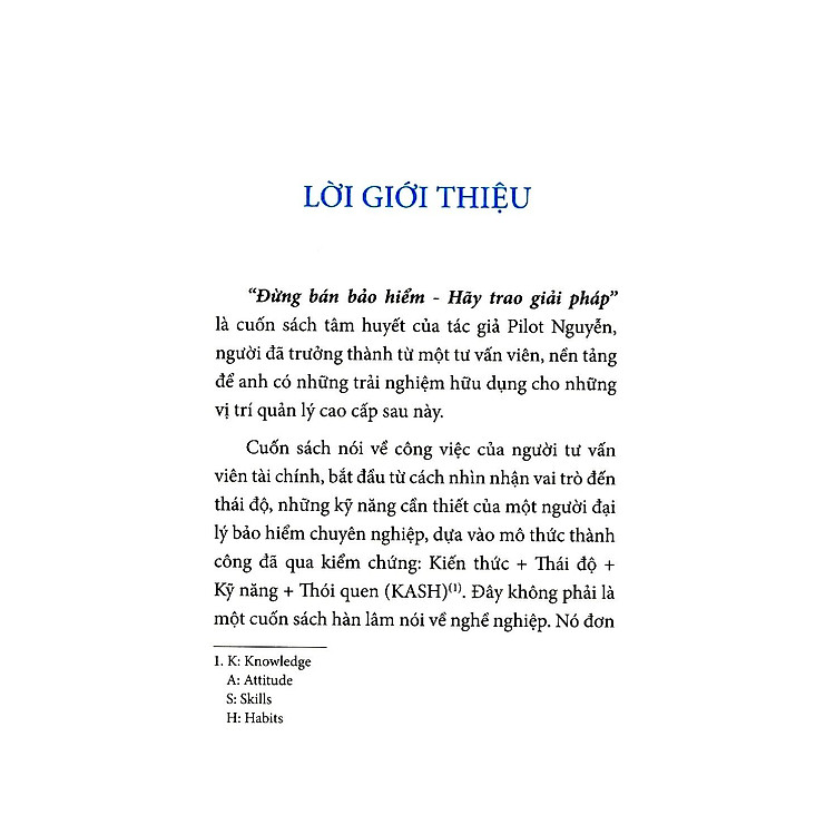 - Cuốn sách “Đừng bán bảo hiểm – Hãy trao giải pháp” của tác giả Pilot Nguyễn, chia sẻ kinh nghiệm từ tư vấn viên đến quản lý cao cấp.