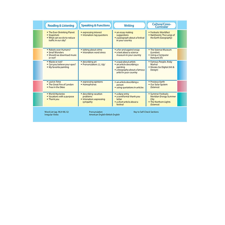 - Cung cấp phần phát âm, kỹ năng nghe và nói, cùng với các hoạt động văn hóa và CLIL.