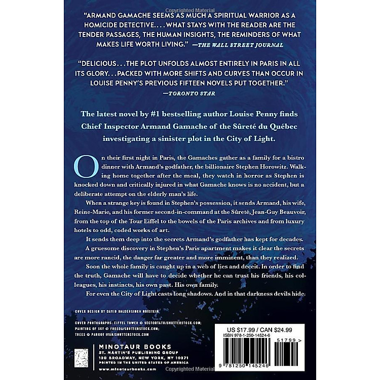 When a strange key is found in Stephen’s possession it sends Armand, his wife Reine-Marie, and his former second-in-command at the Sûreté, Jean-Guy Beauvoir, from the top of the Tour d’Eiffel, to the bowels of the Paris Archives, from luxury hotels to odd, coded, works of art.