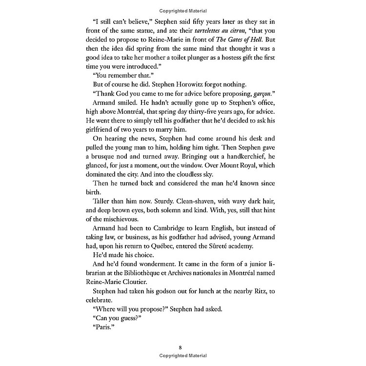 On their first night in Paris, the Gamaches gather as a family for a bistro dinner with Armand’s godfather, the billionaire Stephen Horowitz. Walking home together after the meal, they watch in horror as Stephen is knocked down and critically injured in what Gamache knows is no accident, but a deliberate attempt on the elderly man’s life.