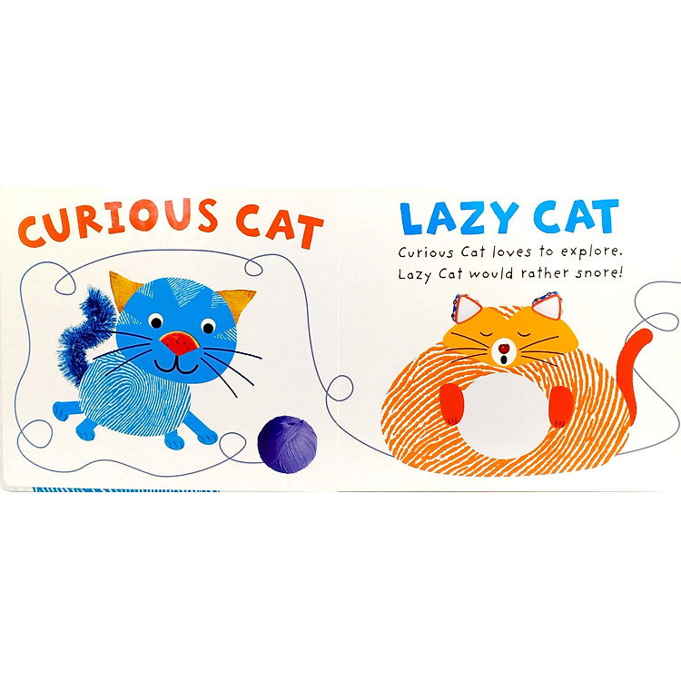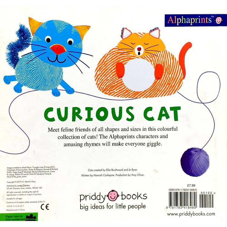 - Sách Alphaprints Curious Cat dành cho trẻ em với hình ảnh mèo con dễ thương và các nhân vật kỳ quặc.