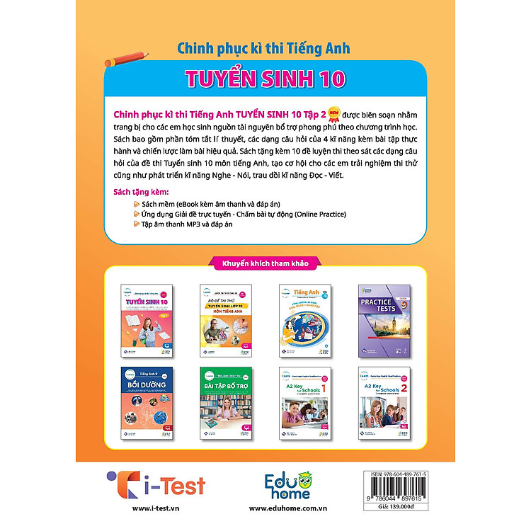 - Sách “Chinh phục kì thi Tiếng Anh – Tuyển sinh 10 tập 2” giúp học sinh chuẩn bị cho kỳ thi tuyển sinh lớp 10 môn tiếng Anh.