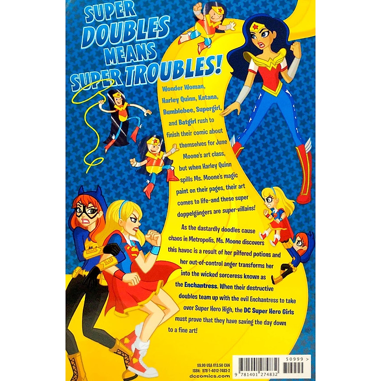Wonder Woman, Harley Quinn, Katana, Bumblebee, Supergirl and Batgirl rush to finish their comic about themselves for June Moone’s art class, but when Harley Quinn spills Ms. Moone’s magic paint on their pages, their art comes to life—and these super doppelgängers are super-villains! As the dastardly doodles cause chaos in Metropolis, Ms. Moone discovers this havoc is a result of her pilfered potions and her out-of-control anger transforms her into the wicked sorceress known as the Enchantress. When their destructive doubles team up with the evil Enchantress to take over Super Hero High, the DC Super Hero Girls must prove that they have saving the day down to a fine art!
