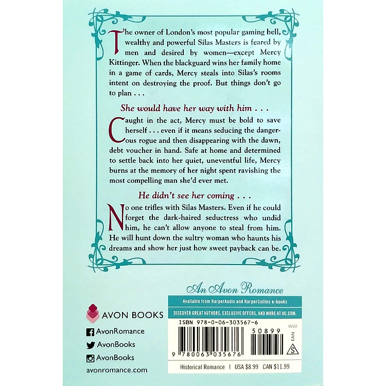 The owner of London’s most popular gaming hell, wealthy and powerful Silas Masters, is feared by men and desired by women—except Mercy Kittinger. When the blackguard wins her family home in a game of cards, Mercy steals into Silas’s rooms, intent on destroying the proof. But things don’t go to plan…
