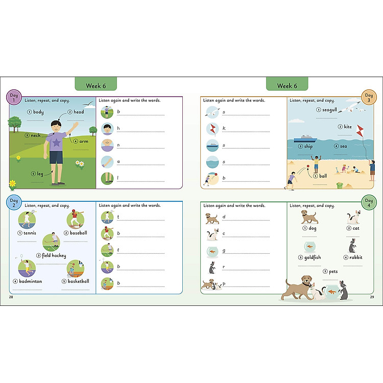 Packed full of fun and useful everyday vocabulary, this visual reference book will capture the imagination of little learners and encourage a love for learning their first English words. The book presents your child with 5 new words to learn and practice each day for four days, then tests these words through a variety of interactive exercises on day five. Over the course of one year, your child will build up a vocabulary of more than 1000 English words.