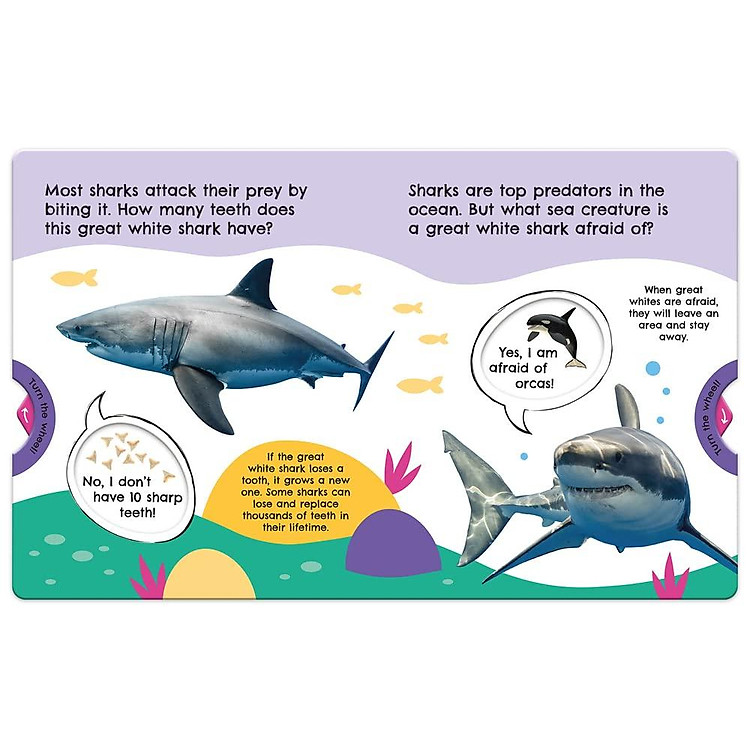 - Sách “First Facts Sharks” là một cuốn sách tương tác với bánh xe xoay, giúp trẻ khám phá kiến thức về cá mập.