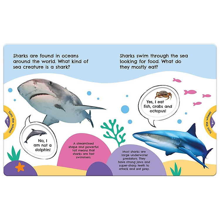 Learn about different sharks by moving and turning the wheels in this fun non-fiction book. First facts are presented through simple questions for the reader to solve by turning a card wheel to discover the correct answers.