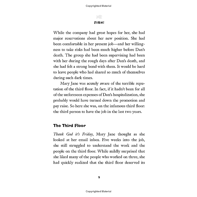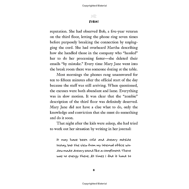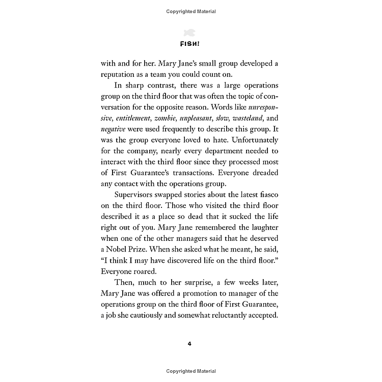 FISH! is the remarkable story of what happens when Mary Jane seeks the help of these unlikely business “experts” and learns their secret: four simple practices that, when applied daily, help anyone to be more energized, effective, and fulfilled.