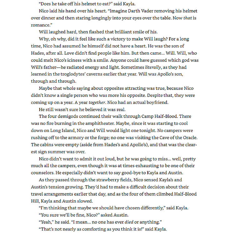 As the son of Hades, Nico di Angelo has been through so much, from the premature deaths of his mother and sister, to being outed against his will, to losing his friend Jason during the trials of Apollo. But there is a ray of sunshine in his life—literally: his boyfriend, Will Solace, the son of Apollo. Together the two demigods can overcome any obstacle or foe. At least, that’s been the case so far…