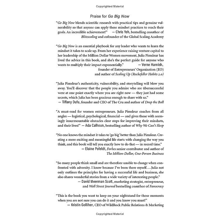 What’s the biggest challenge you face if you want to accomplish great things? It’s getting and keeping the right mindset, according to the hundreds of high achievers Julia Pimsleur has interviewed and worked with as a business coach. In Go Big Now, Pimsleur distills two decades of studying complex mindset practices into eight essential “mindset keys” that can be used by anyone to get the Go Big Mindset and achieve ambitious professional and life goals. Pimsleur shares personal stories of how she used these keys to raise venture capital and build multimillion-dollar companies, and illustrates each key with an example from a leader, CEO, or celebrity whose mindset catapulted them to success. You’ll learn to reframe perceived setbacks, replace unhelpful thoughts and limiting beliefs with empowering ones, and stay motivated to pursue your big goal, even in the face of massive hurdles. With the Go Big Mindset, you’ll boost your mental resilience and discover how to think your way to bigger, better results.