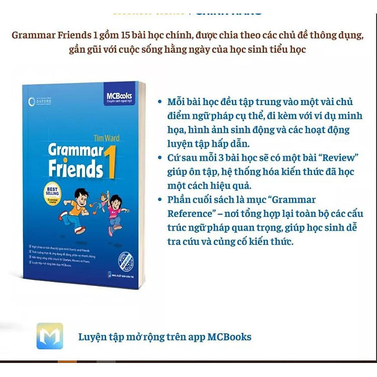 Grammar Friends 1 là tài liệu học tiếng Anh chuẩn quốc tế dành cho học sinh tiểu học và trung học cơ sở, giúp củng cố ngữ pháp qua phương pháp học trực quan. Cuốn sách được phát hành dưới bản quyền của Đại học Oxford – một trong những tổ chức giáo dục hàng đầu thế giới và được phân phối tại Việt Nam bởi MCBooks.
