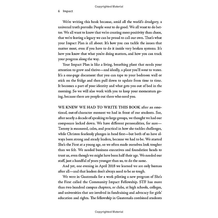 Impact brings you the answers. Drawing on their network and experience as founders of She’s the First, Christen Brandt and Tammy Tibbetts show you how to create your own impact strategy, one that fits into your life and allows you to match what you have with what the world needs.