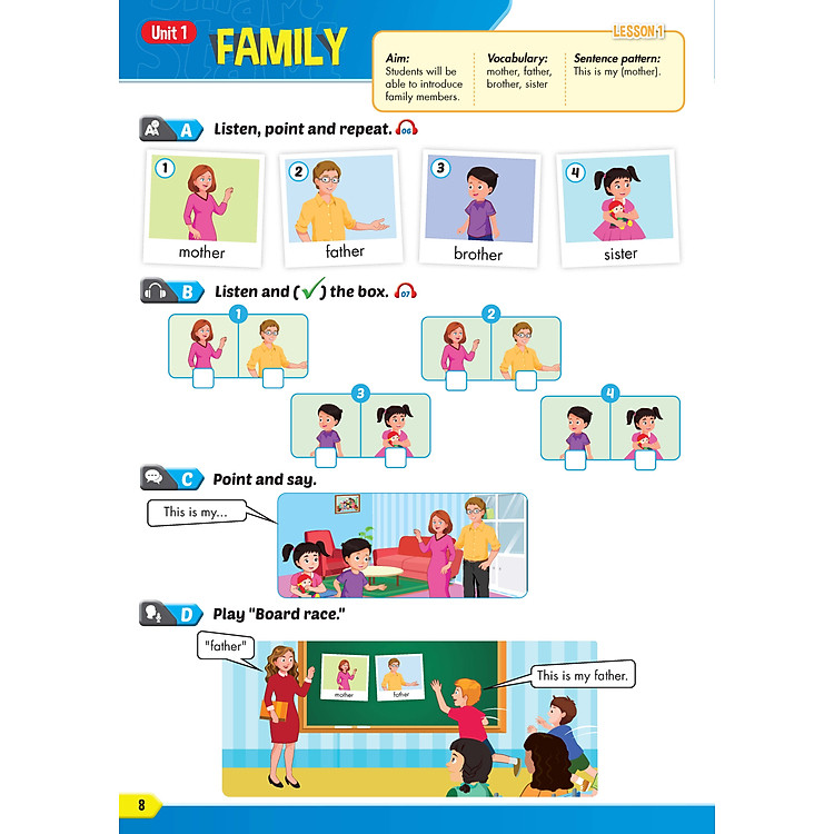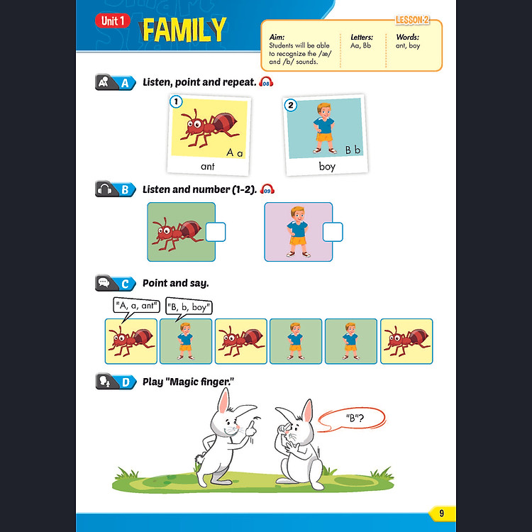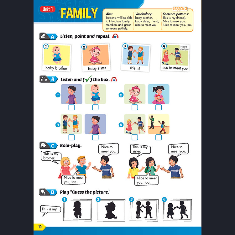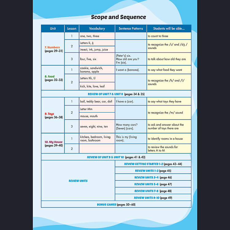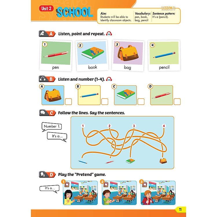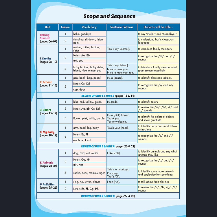 - Kỹ năng: Cung cấp hai giai đoạn phát triển kỹ năng Nghe và Nói mỗi tuần.