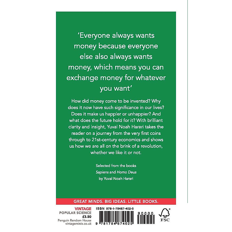 sách nhỏ gọn hơn mình tưởng, cắt ghép từ 3 cuốn nổi tiếng của tác giả, tập trung chủ yếu về vấn đề tiền tệ. Nội dung chỉ nói sơ qua về tiện tệ thôi chứ không quá sâu, ai đọc homo sapiens và homo deus rồi sẽ thấy. Cắt ra như thế này làm mất việc thể hiện rõ ý của tác giả, vì trong 2 quyển kia tiền tệ chỉ là 1 vấn đề nhỏ và còn xâu chuỗi với các ý khác nữa, nên cắt ghép ra như này hơi vụn. Đọc relax 1 chút cũng ok.