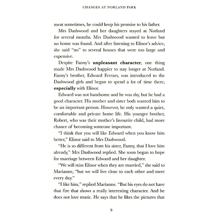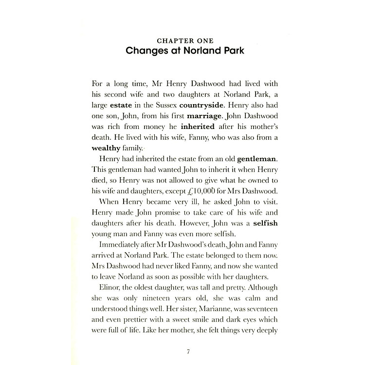 Sense and Sensibility, a Level 5 Reader, is B1 in the CEFR framework. The text is made up of sentences with up to four clauses, introducing present perfect continuous, past perfect, reported speech and second conditional. It is well supported by illustrations, which appear regularly.