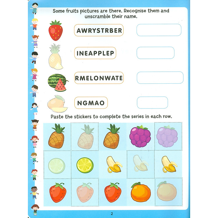 (Sách hoạt động dành cho trẻ em giúp chúng phát triển khả năng tham gia vào nhiều hoạt động đọc viết và tư duy phản biện. ‘Chơi với nhãn dán – Trái cây’ cuốn sách này bao gồm các hoạt động vui nhộn và thân thiện hỗ trợ sự phát triển các kỹ năng vận động tinh, sáng tạo, nhận thức, đọc viết mới và kỹ năng tính toán cho trẻ nhỏ.