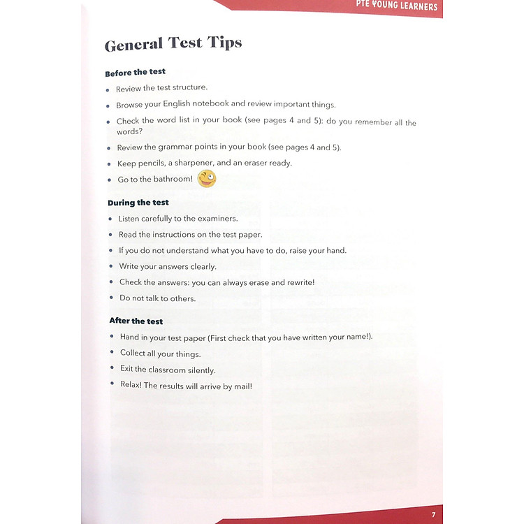 – Lời khuyên chung cho bé khi đi thi, những dặn dò cho bé trước khi làm bài, đang làm bài và sau khi làm bài (pg.7).