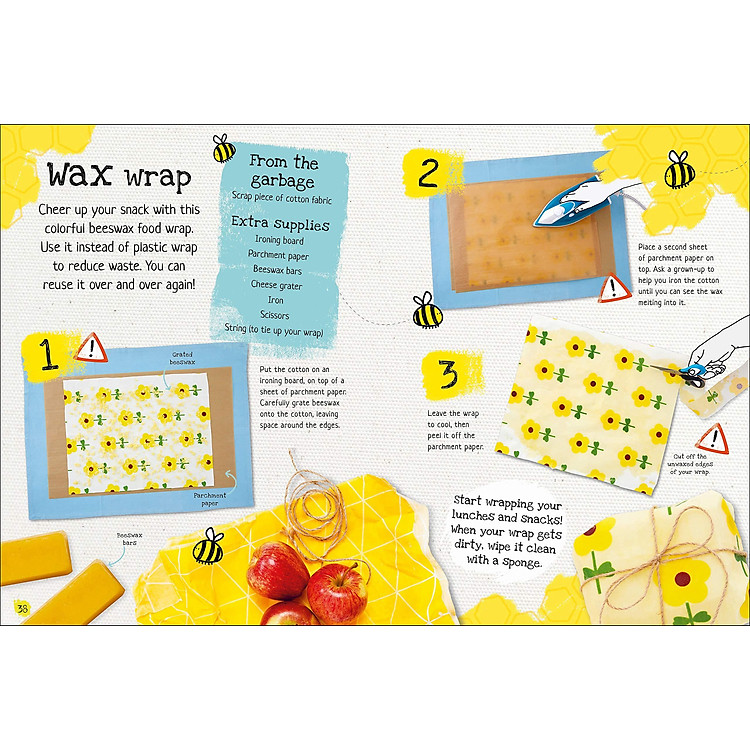 With Recycle and Remake, you will soon be saving trees by making your own seeded recycled paper from junk mail, cleaning up the oceans by turning old carrier bags into kites, friendship bracelets, and colorful weaved baskets and repurposing a cardboard box into a periscope. You’ll also learn about sustainable energies by creating a simple solar oven, cutting down on cling-film by making a food wrap from scrap cotton and beeswax, and turning an old t-shirt into a reusable tote bag so you never need to buy a plastic carrier bag again. You can even grow new plants to clean the air in your own upcycled milk bottle planters and using homemade compost.
