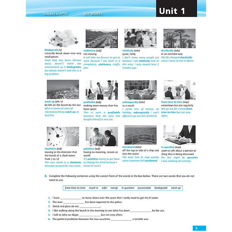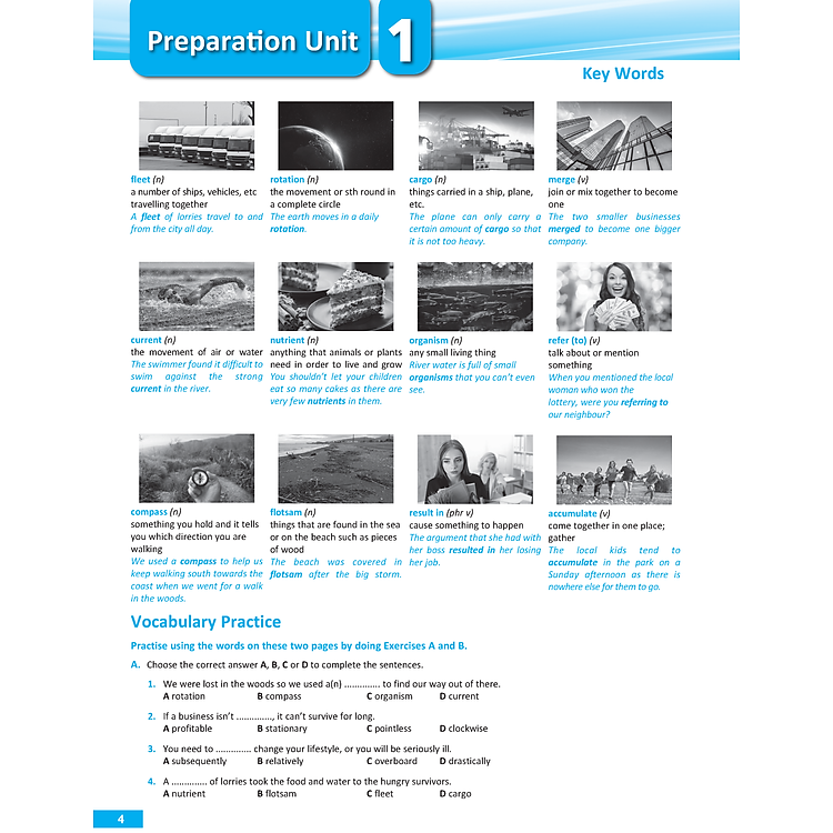 - Mỗi Đơn Vị có từ khóa, hình minh họa, định nghĩa và ví dụ, cùng với Từ vựng trong ngữ cảnh và Đọc hiểu.