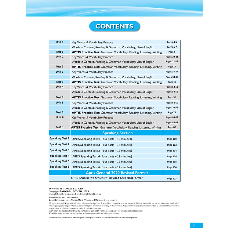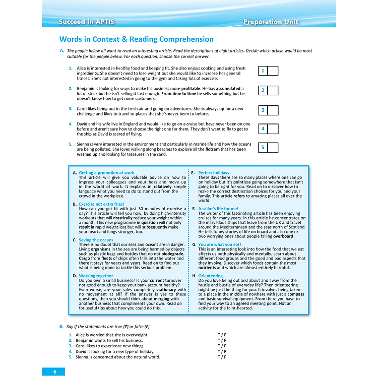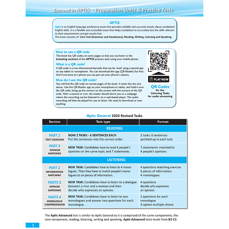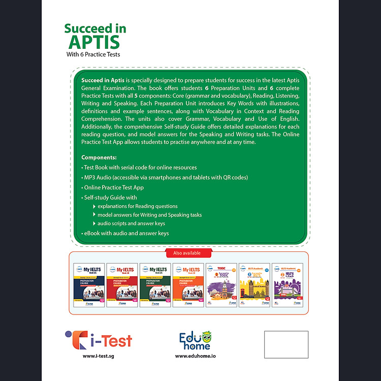 Succeed in Aptis is specially designed to prepare students for success in the latest Aptis General Examination. The book offers students 6 Preparation Units and 6 complete Practice Tests with all 5 components: Core (grammar and vocabulary), Reading, Listening, Writing and Speaking. Each Preparation Unit introduces Key Words with illustrations, definitions and example sentences, along with Vocabulary in Context and Reading Comprehension. The units also cover Grammar, Vocabulary and Use of English.