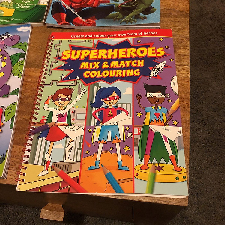 - Sách tô màu “Superheroes Mix & Match Colouring” với thiết kế độc đáo.