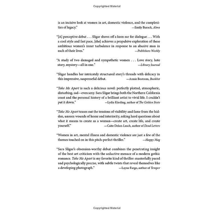 A seductive, twisting tale of psychological suspense, Take Me Apart draws readers into the lives of two darkly magnetic young women pinned down by secrets and lies. Sara Sligar’s electrifying debut is a chilling, thought-provoking take on art, illness, and power, from a spellbinding new voice in suspense.
