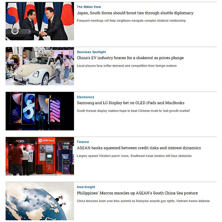 Nikkei Asia là tạp chí tiếng Anh có tên tuổi thuộc tập đoàn Nikkei – Nhật Bản, chuyên viết về những xu hướng kinh tế, công nghệ, chính trị của các nước trong khu vực châu Á – Thái Bình Dương gồm có Việt Nam. Ngoài ra còn cung cấp các phân tích từ chuyên gia, nhà báo về đời sống và văn hóa các nước châu Á. (Trending, Business, Markets,Tech, Politics, Economy, Features, Opinion, Life & Arts).