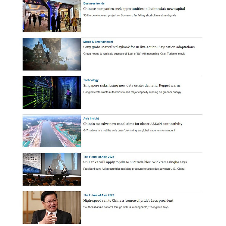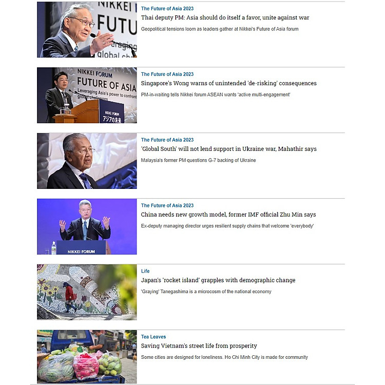 Nikkei Asia là tạp chí tiếng Anh có tên tuổi thuộc tập đoàn Nikkei – Nhật Bản, chuyên viết về những xu hướng kinh tế, công nghệ, chính trị của các nước trong khu vực châu Á – Thái Bình Dương gồm có Việt Nam. Ngoài ra còn cung cấp các phân tích từ chuyên gia, nhà báo về đời sống và văn hóa các nước châu Á. (Trending, Business, Markets,Tech, Politics, Economy, Features, Opinion, Life & Arts).