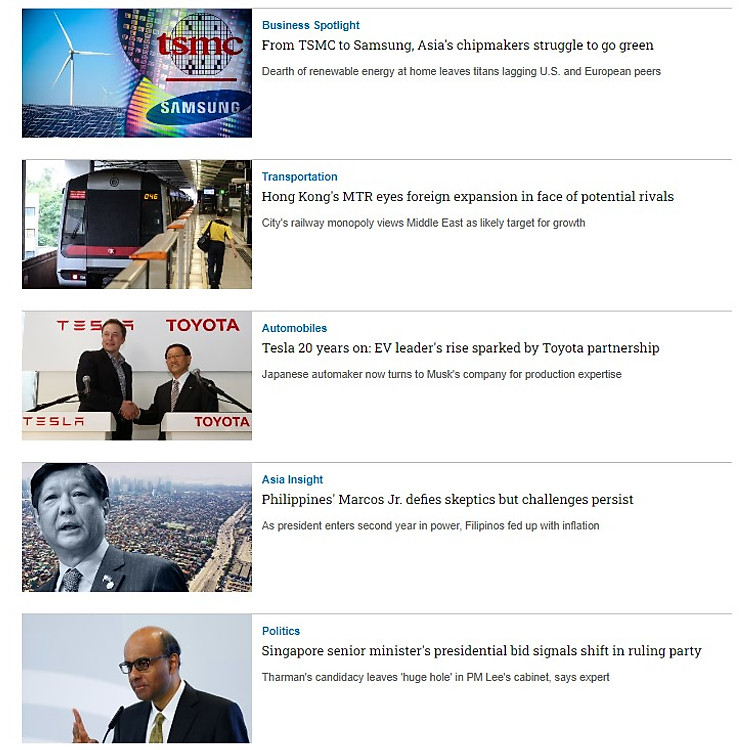 Nikkei Asia là tạp chí tiếng Anh có tên tuổi thuộc tập đoàn Nikkei – Nhật Bản, chuyên viết về những xu hướng kinh tế, công nghệ, chính trị của các nước trong khu vực châu Á – Thái Bình Dương gồm có Việt Nam. Ngoài ra còn cung cấp các phân tích từ chuyên gia, nhà báo về đời sống và văn hóa các nước châu Á. (Trending, Business, Markets,Tech, Politics, Economy, Features, Opinion, Life & Arts).
