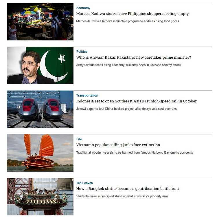 Nikkei Asia là tạp chí tiếng Anh có tên tuổi thuộc tập đoàn Nikkei – Nhật Bản, chuyên viết về những xu hướng kinh tế, công nghệ, chính trị của các nước trong khu vực châu Á – Thái Bình Dương gồm có Việt Nam. Ngoài ra còn cung cấp các phân tích từ chuyên gia, nhà báo về đời sống và văn hóa các nước châu Á. (Trending, Business, Markets,Tech, Politics, Economy, Features, Opinion, Life & Arts).