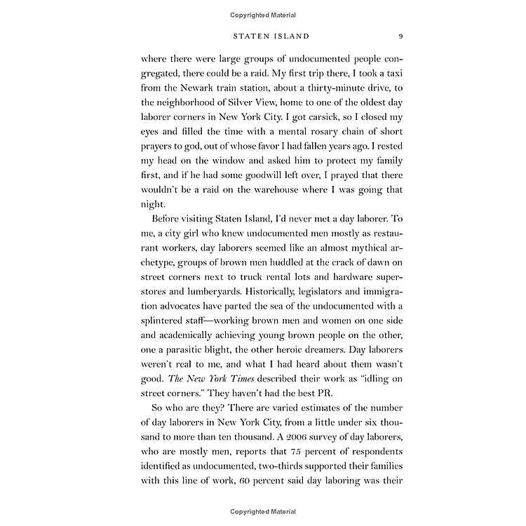 In New York, we meet the undocumented workers who were recruited into the federally funded Ground Zero cleanup after 9/11. In Miami, we enter the ubiquitous botanicas, which offer medicinal herbs and potions to those whose status blocks them from any other healthcare options. In Flint, Michigan, we learn of demands for state ID in order to receive life-saving clean water. In Connecticut, Cornejo Villavicencio, childless by choice, finds family in two teenage girls whose father is in sanctuary. And through it all we see the author grappling with the biggest questions of love, duty, family, and survival.