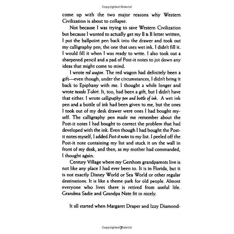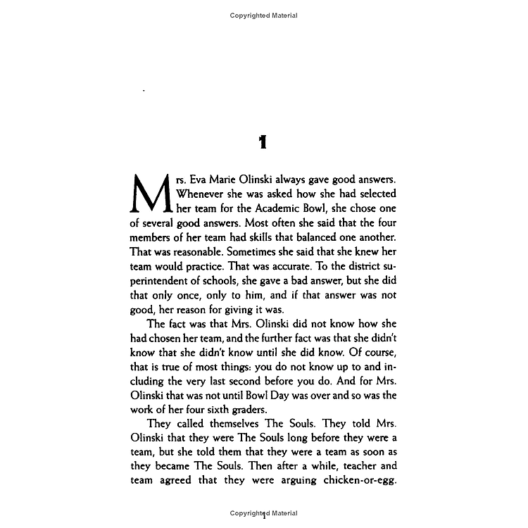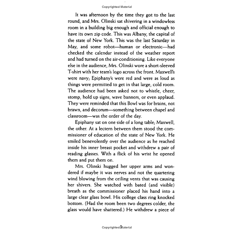 HOW HAD MRS. OLINSKI CHOSEN her sixth-grade Academic Bowl team? She had a number of answers. But were any of them true? How had she really chosen Noah and Nadia and Ethan and Julian? And why did they make such a good team? It was a surprise to a lot of people when Mrs. Olinski’s team won the sixth-grade Academic Bowl contest at Epiphany Middle School. It was an even bigger surprise when they beat the seventh grade and the eighth grade, too. And when they went on to even greater victories, everyone began to ask: How did it happen? It happened at least partly because Noah had been the best man (quite by accident) at the wedding of Ethan’s grandmother and Nadia’s grandfather. It happened because Nadia discovered that she could not let a lot of baby turtles die. It happened when Ethan could not let Julian face disaster alone. And it happened because Julian valued something important in himself and saw in the other three something he also valued. Mrs. Olinski, returning to teaching after having been injured in an automobile accident, found that her Academic Bowl team became her answer to finding confidence and success. What she did not know, at least at first, was that her team knew more than she did the answer to why they had been chosen. This is a tale about a team, a class, a school, a series of contests and, set in the midst of this, four jewel-like short stories — one for each of the team members — that ask questions and demonstrate surprising answers.