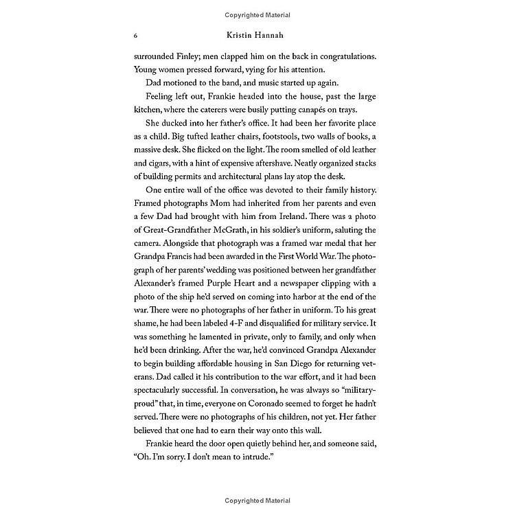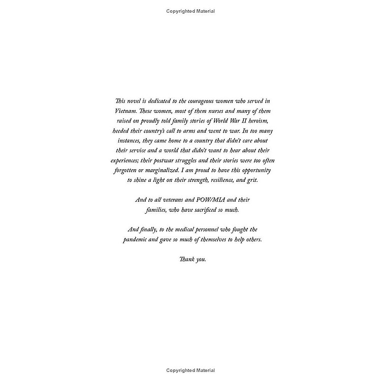 The Women is the story of one woman who goes to war, but it shines a light on the story of all women who put themselves in harm’s way to help others. Women whose sacrifice and commitment to their country has been all too often forgotten. A novel of searing insight and lyrical beauty, The Women is a profoundly emotional, richly drawn story with a memorable heroine whose extraordinary idealism and courage under fire define an era.