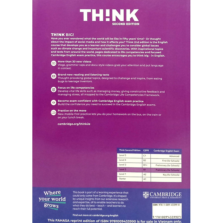 THiNK Second edition is the English course that develops your students as learners and challenges them to consider global issues such as climate change and important scientific discoveries. With inspirational topics and texts from around the world, pages dedicated to life competencies and focused Cambridge English exam practice, this course encourages students to think big – in English