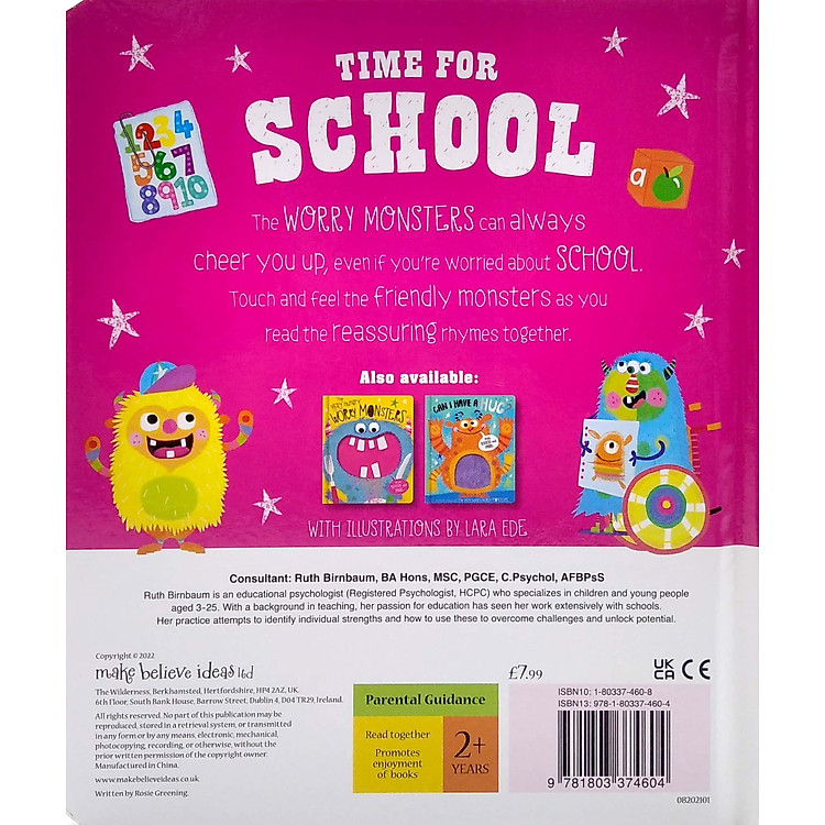 The worry monsters are back, and they’re ready to help make your worries disappear! This sweet board book is a great way to encourage children to think positively about school. The simple rhyme is designed to reassure little worriers, and the friendly monster illustrations have touch-and-feel areas for children to explore. TOUCH-AND-FEEL BOOK ABOUT SCHOOL