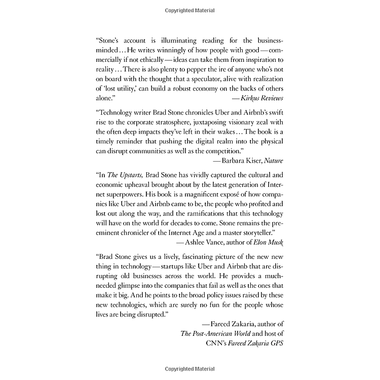 The Upstarts is the definitive story of two new titans of business and a dawning age of tenacity, conflict and wealth. In Brad Stone’s riveting account of the most radical companies of the new Silicon Valley, we discover how it all happened and what it took to change the world.