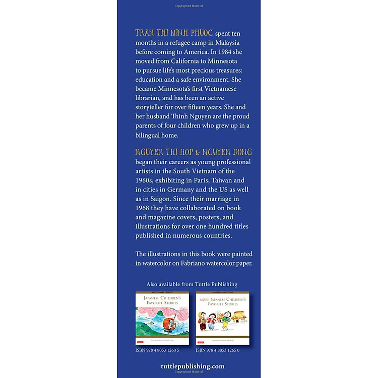 **Winner of “Creative Child Magazine” 2015 Book of the Year Award** **Winner of “Moonbeam Children’s Book Awards” 2015 Gold Medal** This colorfully illustrated multicultural children’s book presents Vietnamese fairy tales and other folk stories providing insight into a rich literary culture. “Vietnamese Children’s Favorite Stories,” is a charming collection of fifteen tales as told by prominent storyteller Tran Thi Minh Phuoc. In it, Tran Minnesota’s first Vietnamese librarian and an active member of the Vietnamese-American community recounts cherished folktales such as “The Story of Tam and Cam” (the Vietnamese version of Cinderella), “The Jade Rabbit,” and “The Legend of the Mai Flower.” With beautiful illustrations by veteran artists Nguyen Thi Hop and Nguyen Dong, children and adults alike will be enchanted by Tran’s English retellings. Stories in which integrity, hard work and a kind heart triumph over deception, laziness, and greed as gods, peasants, kings and fools spring to life in legends of bravery and beauty, and fables about nature. The “Children’s Favorite Stories” series was created to share the folktales and legends most beloved by children in the East with young readers of all backgrounds in the West. “Vietnamese Children’s Favorite Stories” will keep Vietnam’s folktales alive for them and the legions of young readers who enjoy multicultural children’s books and stories set in faraway lands. Other multicultural children’s books in this series include: “Asian Children’s Favorite Stories, Indian Children’s Favorite Stories, Indonesian Children’s Favorite Stories, Japanese Children’s Favorite Stories, Singapore Children’s Favorite Stories, Filipino Favorite Children’s Stories, Favorite Children’s Stories from China & Tibet, Chinese Children’s Favorite Stories, Korean Children’s Favorite Stories, ” “Balinese Children’s Favorite S””